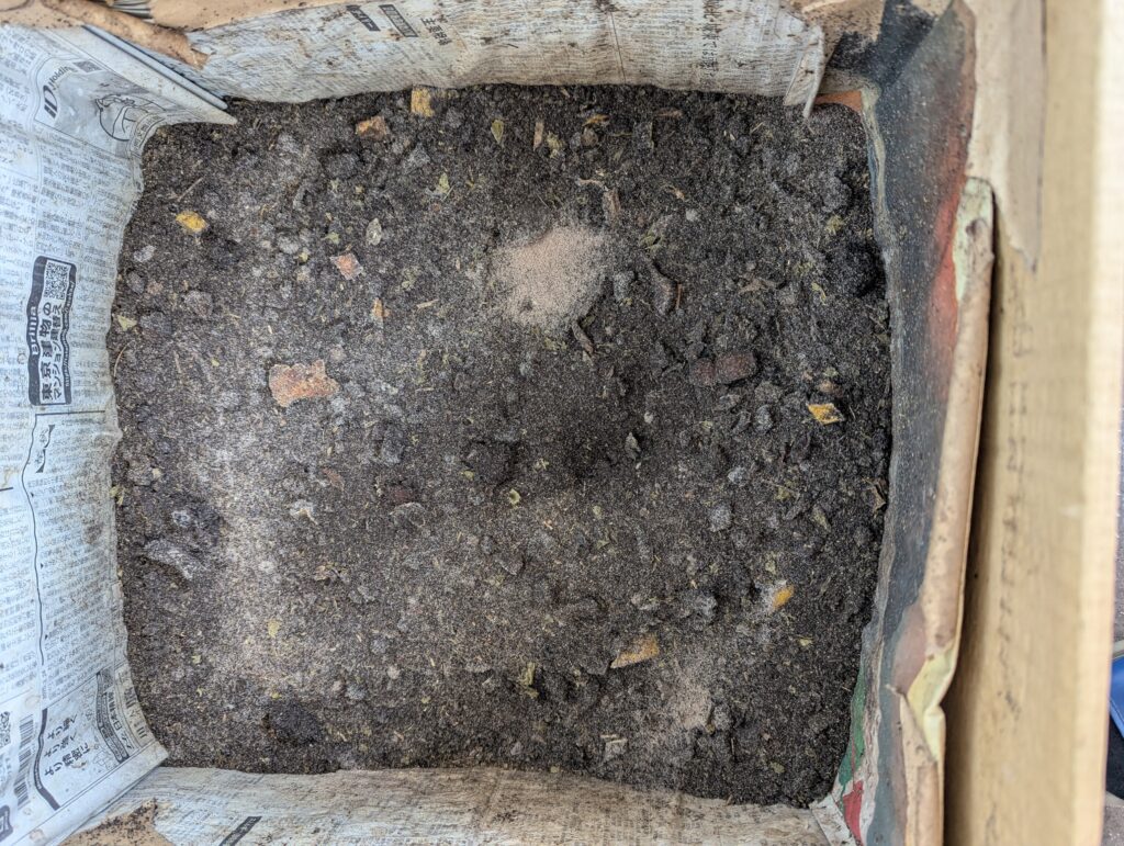 よく見ると、乾燥した柑橘類の皮がそのまま残っていますね。冬場の低温で微生物の動きが鈍かったことと、半年間の運用で分解率の限界がきていたようです。