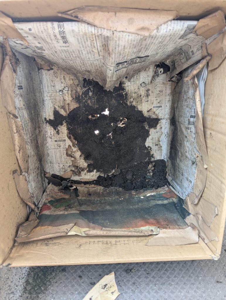 見事に底が抜けていました(笑)。 表面はサラサラに見えても、重力で水分は底に溜まります。新聞紙の補強も虚しく、湿気でダンボールの劣化が進んだようです。
