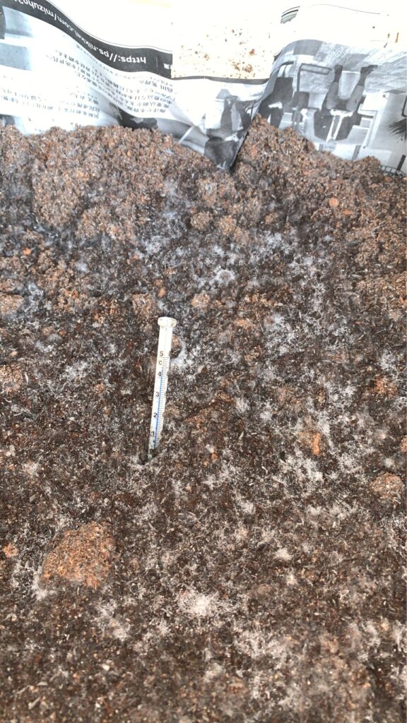 今回、なかなか温度が上がらないので9日目に米ぬかを1Lほど追加投入したところ、翌日の10日目、表面に白いカビ(有用菌)が発生し、温度が40〜50℃まで上昇しました。