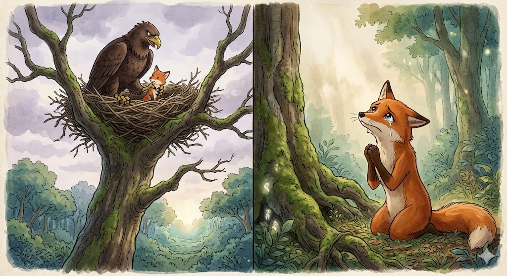 ところが、ある日、お腹を空かせた鷲は、狐がいない隙に、狐の子供をさらって自分の巣で食べてしまいました。 帰ってきた狐は、子供がいなくなったことを知り、大粒の涙を流しました。でも、高い木の上の鷲には、地面を這う狐はどうすることもできません。 狐はただ、毎日泣きながら空を見上げ、天にお祈りをするしかありませんでした。