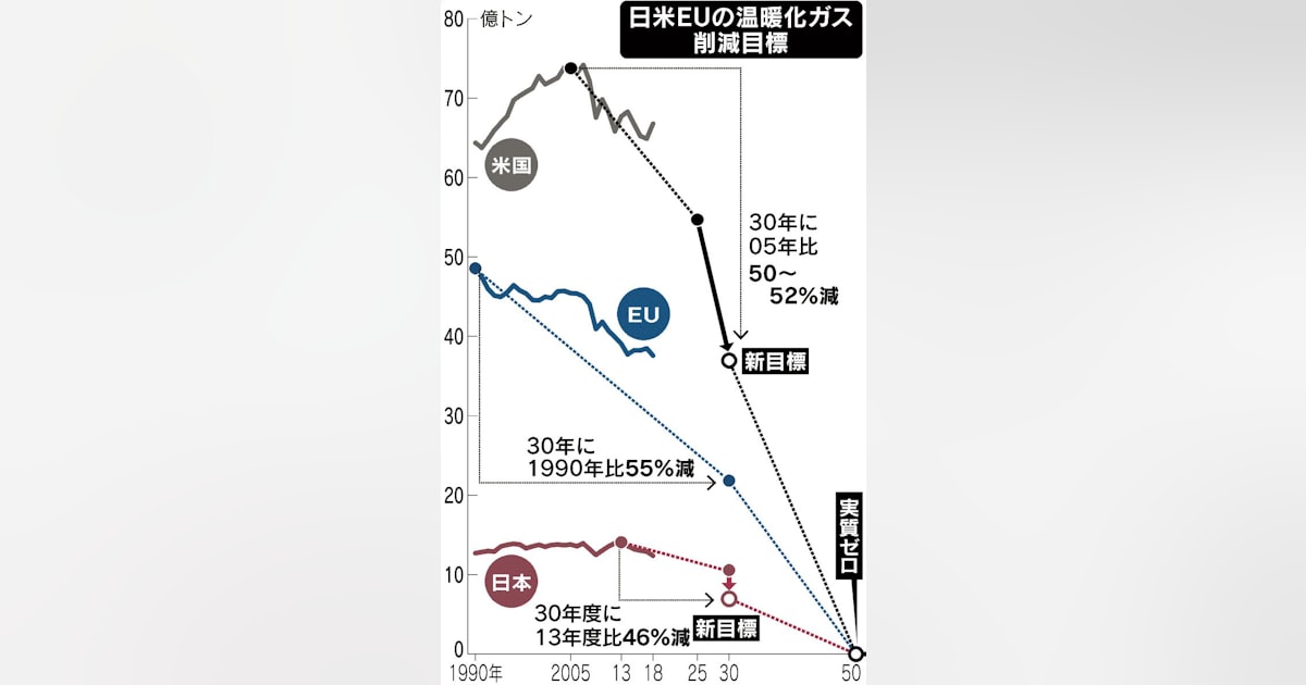 日本、温暖化ガス13年度比46%減 2030年目標 気候サミット開幕 米は05年比半減、再生エネ重要に - 日本経済新聞